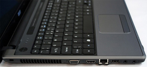 Основная часть портов располагается на левой грани ноутбука Aspire 5553G. Здесь можно увидеть видеовыход VGA для подключения внешнего монитора, рядом располагается цифровой порт HDMI, предусмотренный для передачи видео- и аудиосигнала. Также на этой стороне есть два аудиоразъема, сетевой порт LAN и интерфейс USB 2.0.