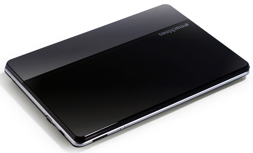 Зачастую ноутбуки марки Acer eMachines не могут похвастаться креативностью и стильностью. С eMachines D440 ситуация несколько другая. С одной стороны, форма корпуса абсолютно обычна: закругленные углы, скошенные края крышки, габариты - 342x245x32 мм. С другой стороны, сочетание пластика и алюминия встретишь в ноутбуках не так часто. Тем более, в таком соотношении и с такой задумкой. Так, чуть больше половины крышки корпуса выполнено из черного глянцевого пластика, а вторая часть – из матового серебристого, стилизованного под металл. На черном фоне ненавязчиво смотрится надпись eMachines, которая как бы подсказывает о принадлежности ноутбука именно к этой линейке.