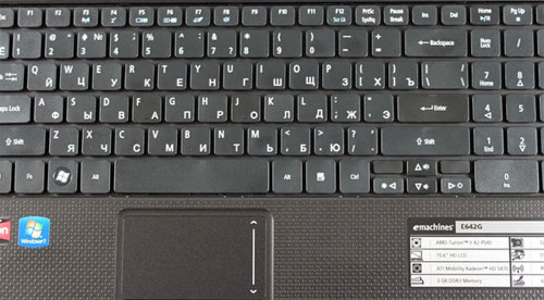 Клавиатурный блок ноутбука eMachines E642G построен по принципу островного. Иначе говоря, каждая клавиша располагается отдельно и независимо друг от друга. Все кнопки имеют крупные размеры и работают с длинным ходом. Причем, клавиши нажимаются четко и не громко.