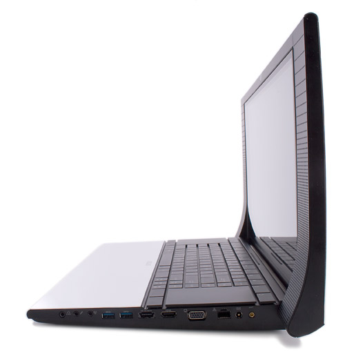 На правом торце находятся три гнезда для аудиоустройств (одно для подключения наушников с поддержкой S/PDIF, гнездо микрофона, линейный вход). Дальше идут два порта USB 3.0, комбинированный порт USB/eSATA, порт HDMI, видеовыход VGA. Далее находится разъем RJ-45, гнездо для подключения адаптера питания и последним идет коннектор антенны.
