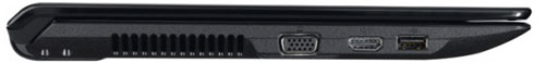 Левая грань заполнена скромнее. Кроме цифрового порта HDMI и аналогового выхода D-Sub есть еще один порт USB. Вся остальная часть правого торца занята вентиляционной решеткой.