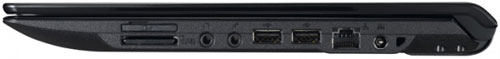 С портами и разъемами дело обстоит следующим образом. На правой стороне ASUS PRO34Jc сосредоточена основная часть интерфейсов. Здесь можно увидеть два аудиоразъема для подключения наушников и микрофона, а также два порта USB 2.0. Также справа расположены разъем сетевой карты RJ-45, кардридер и гнездо для блока питания.