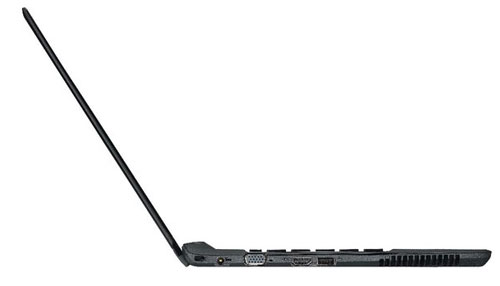 На левой стороне ноутбука портов не намного больше. Помимо аналогового выхода VGA, предназначенного для подключения внешнего монитора, можно увидеть цифровой порт HDMI и интерфейс USB 2.0. Также на левом торце есть гнездо для подзарядки и отверстие Кенсингтонского замка. Всю остальную часть левой стороны занимает вентиляционное отверстие.