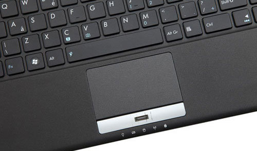 Под тачпадом можно увидеть две клавиши, скрытые хромированной цельной полосой. В середине клавиши-«качельки» уютно располагается сенсор отпечатка пальца. Он предотвращает доступ посторонних к конфиденциальной информации на ноутбуке.