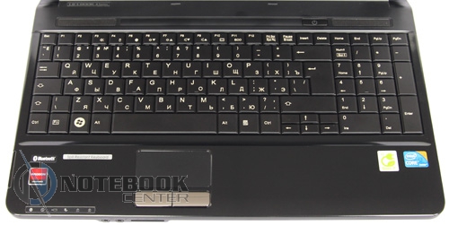 В интерьере ноутбука используется два вида пластика черного цвета: глянцевый и матовый. Подладонная область – зеркальная. О непрактичности такой поверхности и говорить не стоит: следы от пальцев будут видны невооруженным взглядом. Панель, находящаяся над клавиатурой, выполнена из матового пластика «полосатой» текстуры. На ней находятся динамики аудиосистемы и кнопка включения ноутбука. К слову, рамка вокруг дисплея тоже матовая.