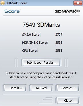Бенчмарк 3DMark06 проводился с разрешением 1024x768. Fujitsu LIFEBOOK AH530 набрал 7549 баллов, из которых SM2.0 Score – 2707, HDR/SM3.0 Score – 3533, CPU Score – 2555.