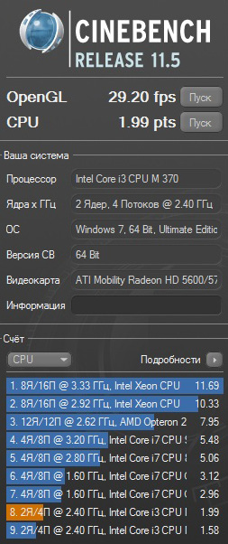Cinebench R11.5 – тест для измерения уровня производительности компьютера. Он запускает несколько тестов для проверки быстродействия процессора и видеокарты в реальных ситуациях. LIFEBOOK AH530 получил: OpenGL – 29.20 fps, CPU – 1.99 pts.
