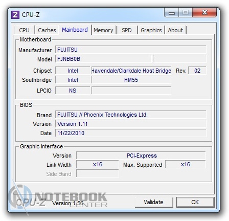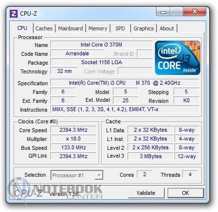 Как отмечалось выше, к нам в руки попал ноутбук Fujitsu LIFEBOOK AH530/GFX Blue (VFY:AH530MRZ05RU). «Сердцем» этого мобильного ПК является двухъядерный процессор Intel Core i3-370M. Появился этот CPU ровно год назад, изготовлен по новому 32-нм техпроцессу, имеет 3 Мб кэш третьего уровня. Тактовая частота процессора составляет 2400 МГц, максимальное энергопотребление равно 35 Вт. Увы, но Intel Core i3 не оснащается технологией разгона (TurboBoost). Зато технология Hyperthreading позволяет двухъядерному процессору использовать все 4 потока.