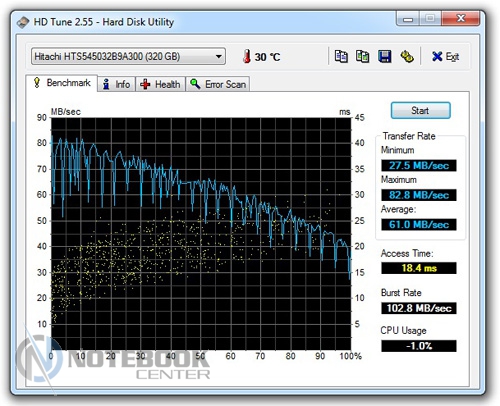 Жесткий диск показал неплохие скоростные характеристики в приложении HD Tune 2.55. Средняя скорость чтения составила 61 Мб/с (минимальная – 27.5 Мб/с, максимальная – 82.8 Мб/с). Время доступа, согласно результатам, равна 18.4 мс, скорость съемки – 102.8 Мб/с.