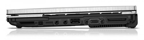 Правая сторона загружена более остальных. Здесь находятся кардридер, слот расширения для 54 мм карт памяти, видеовыход VGA. Также видны интерфейс USB 2.0, разъем для подключения док-станции, линейные порты и IEEE1394.