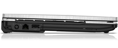 На противоположной грани располагаются модемный разъем, оптический накопитель DVD+/-RW SuperMulti Double Layer и порт USB. Подзарядка ноутбука осуществляется через специальное гнездо, находящееся на этой же стороне.