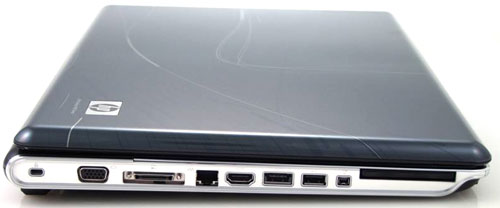 На левой стороне ноутбука HP HDX X18 предусмотрена основная часть интерфейсов. По порядку они расположены так. Ближе к краю находится специальный отсек для универсального слота расширения ExpressCard. За ним следует FireWire, позволяющий передавать данные со скоростью 400 Мбит/с, два порта USB, один из которых совмещен с eSATA и цифровой интерфейс HDMI. Кроме этого, на левой грани размещаются разъем сетевого контроллера RJ-45, со скоростью передачи данных 1 Гбит/с, разъем для подключения док-станции и 15-контактный видеовыход VGA. Подключение док-станции решит извечную проблему с подключением многих периферийных устройств. Более того, если необходимо перенести ноутбук с одного места на другое, то проблем с проводами будет меньше. В самом конце левого торца уютно разместилось отверстие Кенсингтонского замка.