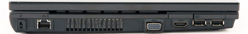 Левая грань занята слотом ExpressCard34, двумя горизонтальными портами USB, портом HDMI, VGA, разъемом для подключения сетевого адаптера к локальной сети (RJ-45), отверстием для замка Кенсингтона. Справа пользователь обнаружит 2 порта USB, модем, оптический привод и разъем питания.