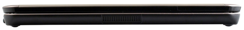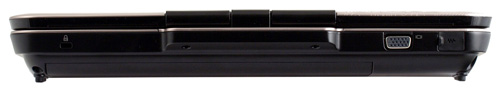 На задней панели расположен аналоговый выход VGA и порт замка Кенсингтон. Эти порты подключаются очень редко и в основном тогда, когда ноутбук выключен (т.е. крышка закрыта), поэтому подключение не доставляет каких-то неудобств. Также здесь находится разъем проводной сети, зачем-то закрытый резиновой крышечкой.