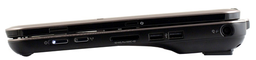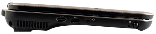 На правой грани, почти под экраном, расположен разъем для штекера питания. Рядом со штекером находится сетевой индикатор состояния питания. Далее расположены два порта USB и кардридер. На левой грани находится решетка вентиляции. Здесь же расположены цифровой порт HDMI и один USB. Рядом находится микрофонный вход и выход на наушники. Для простоты, перечень выглядит так: 3 порта USB 2.0, VGA (D-Sub), HDMI, вход микрофонный, выход аудио/наушники, LAN (RJ-45).
