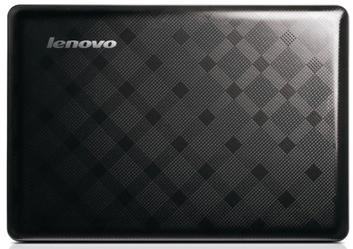 Внешний вид ноутбука привлекает своим неординарным оформлением. На плавно скошенных панелях IdeaPad U455 виден оригинальный ромбовидный рисунок. В декоративном узоре сочетаются, как черные цвета, так и серые, что смотрится довольно интересно и стильно. На внешней поверхности ноутбука кроме экстравагантного рисунка заметен темный логотип компании Lenovo.