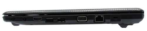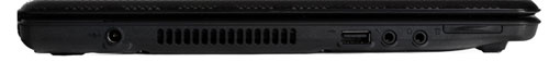 Левая сторона Lenovo IdeaPad U455 заполнена немного. Здесь видны только два аудиоразъема, интерфейс USB и гнездо питания. Также на левой грани располагается кардридер 5-в-1, читающий форматы Secure Digital, MultiMediaCard, Memory Stick, MS PRO, xD-Picture Card. Все остальное место занимает вентиляционная решетка.
