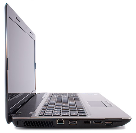 На левой грани находятся разъем сетевого контроллера, видеовыход VGA и цифровой порт HDMI. Также слева располагаются слот замка кенсингтон, два порта USB, причем один совмещен с eSATA, и слот расширения ExpressCard, читающий 34 мм карты памяти.