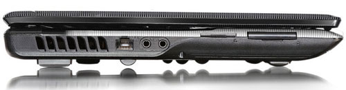 Левая грань содержит два линейных разъема, через которые можно подключать микрофон и наушники. Рядом с аудиовыходами располагается сетевой порт и большая вентиляционная решетка. Ближе к переднему краю можно увидеть слот расширения Express Card /34мм и кардридер, читающий форматы SD/MMC/MS/XD.