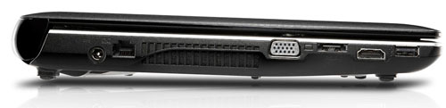 На левой грани MSI FX400 сосредоточена основная часть портов и разъемов. В первую очередь выделяется порт USB 2.0 и интерфейс eSATA, с помощью которых достаточно легко подсоединяется периферийное оборудование. Также слева располагаются 15-контактный видеовыход D-Sub и интерфейс HDMI, позволяющий передавать сигнал в цифровом виде. Возле вентиляционного отверстия есть гнездо для подзарядки и разъем сетевой карты RJ-45.