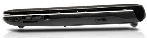 Основная часть правой стороны ноутбука занята пишущим оптическим приводом. Рядом расположены два интерфейса USB 2.0, модемный разъем и два линейных аудиоадаптера для подключения микрофона и наушников. Кардридер можно увидеть там же, на правом торце.