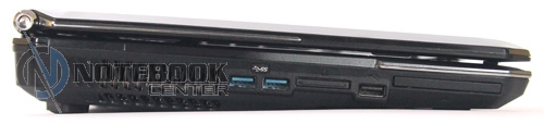 На левой стороне ноутбука MSI GX660R расположены три интерфейса USB, предусмотренные для подключения периферийных устройств. Два из них USB 3.0 со скоростью передачи 4.8 Гб/с находятся по одну сторону от мультиформатного кардридера 4-в-1, а последний USB 2.0 – по другую. Кроме устройства чтения карт памяти форматов SD, MS, MMC и XD, слева можно увидеть универсальный слот расширения ExpressCard.