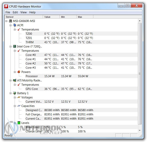 Помимо этого, ноутбук MSI GX660R тестировался пакетом CPUID Hardware Monitor. Нашей целью было проследить изменения температуры нагрева видеокарты и центрального процессора. Значения приведены ниже. Минимально для CPU – 44 градуса по Цельсию, максимально – 76 градусов. Для графического контроллера: минимум – 35 градусов, максимум – 62 градуса по Цельсию. Кстати, защитить систему от перегрева поможет эксклюзивная технология Cooler Boost. Благодаря специальной кнопке с аналогичным названием можно охладить внутренние компоненты за счет повышения частоты вращения вентилятора. Таким образом, в знойные дни температура внутри системы останется комфортной.