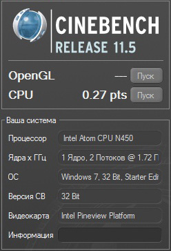 Во время тестирования центрального процессора на производительность при создании 3D сцен (утилита Cinebench R11.5) нетбук набрал 0.27 баллов.