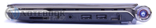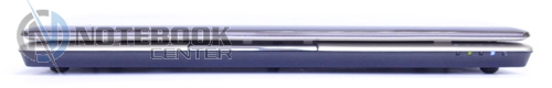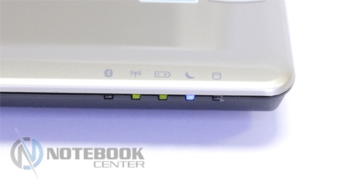 На передней грани, как уже упоминалось, порты отсутствуют, но есть пять индикаторов: активация Bluetooth (светится синим), работа беспроводной сети (зеленым) или широкополосной 3G/WiMax, доступной опционально, (синим). Рядом располагается индикатор состояния батареи, который сигнализирует зеленым цветом, когда батарея заряжается и оранжевым – в разряженном состоянии. При нахождении нетбука в режиме ожидания, а также при работе оптического привода или винчестера владелец увидит на соответствующих индикаторах мигающий синий цвет.
