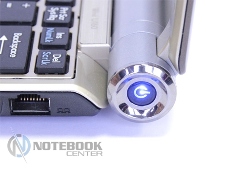 Стильным элементом дизайна нетбука также можно считать хромированные цилиндрические шарниры, с помощью которых фиксируется крышка. Помимо этого, в конце одной из таких петель находится кнопка включения нетбука с ярко-синим индикатором.