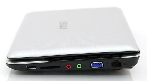 Работа нетбука в автономном режиме обеспечивается 3-секционным аккумулятором. Понятно, что при такой батарее нетбук долго не проработает, а вот при замене литий-ионного аккумулятора на 6-секционный, время существенно увеличится до 7 часов. Дизайн Как выглядит нетбук MSI Wind U135? Во первых, традиционные скошенные бока с обратной стороны крышки экрана, а, во вторых, сильно закругленные углы корпуса. Толщина нетбука по всей поверхности распределяется неравномерно. Чем ближе передняя грань, тем заметнее уменьшение толщины.