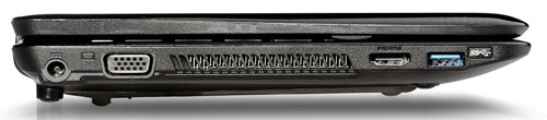 Что касается набора портов Wind U270, то выглядит он, по большому счету, стандартно. На левой от пользователя грани можно заметить вентиляционную решетку, разъем для подключения блока питания, видеовыход VGA, интерфейс HDMI и USB 3.0. C помощью последнего, к слову, можно передавать информацию в 10 раз быстрее, чем посредством обычного USB 2.0.