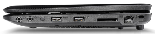 На правой грани разместились два аудиоразъема (микрофонный вход и выход под наушники), 2 порта USB 2.0, мультиформатный кардридер (SD/SDHC/MMC/MS), разъем RJ-45 и Kensington Lock. Увы, но места для оптического привода не хватило.