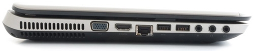 На левом торце ноутбука Pavilion dv6-6b63er находится основная группа портов и разъемов. Здесь находятся два USB 3.0, разъем сетевого контроллера RJ-45, цифровой интерфейс HDMI и видеовыход VGA. На левой грани ближе к переднему торцу можно увидеть три аудиоразъема (два для наушников и один для микрофона). С этой же стороны расположилось вентиляционное отверстие, через которое выходит теплый воздух. Два выхода на наушники - это очень удобно, ведь вы сможете послушать музыку или посмотреть фильм вдвоем с кем-то в любой поездке.