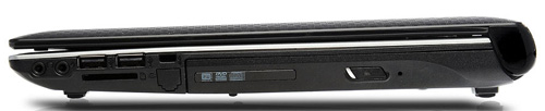 На правой грани расположение немного отличается от стандартного. Здесь основная часть интерфейсов просто нагромождена ближе к переднему краю. В этой группе можно увидеть два порта USB 2.0, аудиоразъемы для подключения микрофона и наушников и кардридер 2-в-1, читающий форматы SDXC/MMC. Также есть модемный разъем RJ-45, закрытый специальной заглушкой и отверстие Кенсингтонского замка. А вот все остальное место справа занимает оптический накопитель DVD Super-Multi.