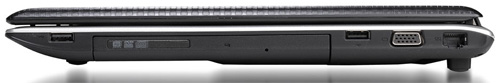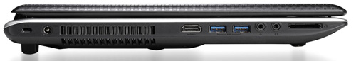 В ноутбуке собраны самые «ходовые» на данный момент разъемы. На гранях лэптопа не найти eSATA или ExpressCard, место нашлось лишь самым необходимым интерфейсам. Слева разместился кардридер, два аудиоразъема, два порта USB 3.0, интерфейс HDMI и Kensington Lock. Противоположная сторона занята оптическим приводом DVD±RW DL, двумя портами USB 2.0, видеовыходом VGA и разъемом RJ-45. По сути, домашнему ноутбуку больше ничего и не надо.