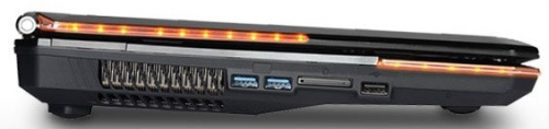 На гранях лэптопа расположились 2 порта USB 3.0, один USB 2.0, мультиформатный кардридер 5-в-1, интерфейс HDMI, видеовыход VGA, RJ-45, eSATA, привод Blu-ray или DVD Super Multi, HD веб-камера (720p), микрофонный вход и выход под наушники. MSI GX680 поддерживает технологию i-Charger. Благодаря ней скорость зарядки устройств через USB возрастает в несколько раз.