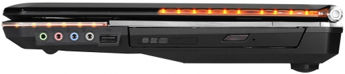 По краям крышки и на гранях топкейса также имеются красные светодиодные полоски. Их режим мерцания настраивается программно. Кстати, светодиодными вставками оформлены не только торцы лэптопа. Подсвечиваются также мультимедийные кнопки и углы тачпада. Выглядит MSI GX680 внушительно и монолитно. Спереди он чуть тоньше, а вот к задней грани аппарат заметно утолщается. Его масса составляет 3.5 кг. И крышка, и топкейс по углам подрезаны. Впрочем, внешний вид это не портит.