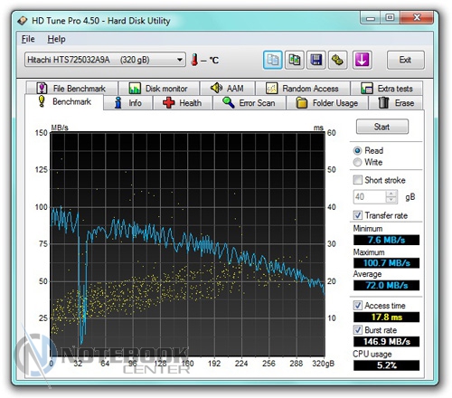 Для тестирования жесткого диска использовалась утилита HD Tune Pro 4.50. Она детально тестирует работоспособность винчестера. Благодаря этому приложению можно узнать не только скорость передачи данных и время доступа, но и температуру харддиска.