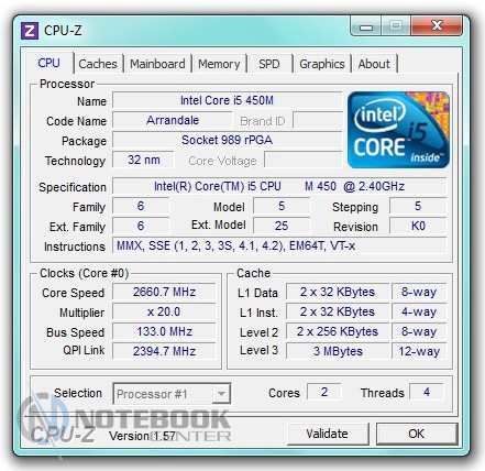 Ноутбук НР ProBook 6550b WD702EA оснащается двухъядерным процессоромIntel Core i5-450Mс тактовой частотой 2.4 ГГц и кэшем третьего уровня, составляющим 3 Мб. Данный процессор построен по 32-нм техпроцессу на микроархитектуре Westmere. Для ЦП характерна обработка нескольких потоков информации одновременно и разгон до частоты 2.6 ГГц. Это возможно благодаря технологиям Turbo Boost и Hyper-Threading.