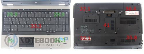 В режиме простоя НР ProBook 6550b остается довольно холодным. Как верхняя, так и нижняя поверхности в течение продолжительного времени будут весьма комфортными. Здесь температура не превышает 31.1 градуса при температуре помещения 26.5 градусов по Цельсию. Самым «горячим» местом оказалась середина рабочей области.