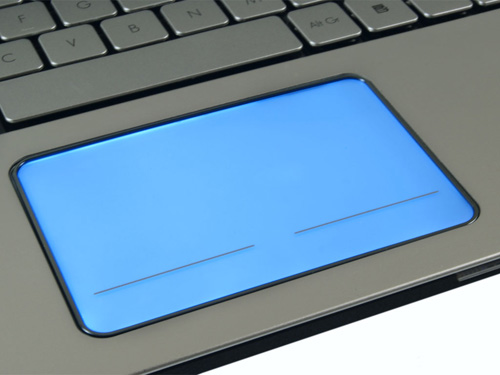 Тачпад в данном аппарате стоит особняком. И дело здесь не в его механических свойствах. Во-первых, он не содержит «мышиных» кнопок (как у ноутбука Apple), они спрятаны под двумя еле заметными линиями. Во-вторых, сенсорная площадка загорается голубым светом при нажатии. Выглядит это впечатляюще! Особенно в темной комнате. Такое решение может служить в качестве своеобразной подсветки при работе с клавиатурой. Тачпад поддерживает абсолютно все мультижесты, имеется также полоса вертикальной прокрутки.