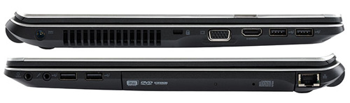 Packard Bell EasyNote TX86 имеет стандартный набор портов и интерфейсов. На левой грани разместился разъем питания, Kensington lock, VGA, HDMI, два порта USB 2.0. На правой стороне имеется разъем для подключения наушников, разъем для подключения микрофона, 2 порта USB 2.0, оптический привод и сетевой разъём RJ-45 (LAN).