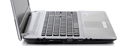 Основная часть интерфейсов Samsung RV511 располагается слева. Здесь есть два порта USB 2.0, два аудиоразъема для подключения микрофона и наушников и видеовыход VGA. Помимо этого, на левой стороне размещаются разъем сетевого контроллера RJ-45 и встроенный кардридер 4-в-1. Часть места отведено и для цифрового интерфейса HDMI. Традиционно в самом конце находится гнездо для подзарядки.