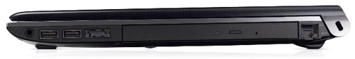 На противоположной стороне ноутбука расположены порты, предусмотренные для подключения периферийного оборудования. В их числе eSATA, комбинированный с USB 2.0 и два обычных интерфейса USB. Для передачи данных по сети со скоростью 1000 Мбит/c предназначен разъем сетевого контроллера RJ-45. Также на правом торце есть совмещенный аудиоразъем и встроенный оптический накопитель, занимающий основное место. С помощью привода можно воспроизводить и записывать диски различных форматов, в том числе и двухслойные. Конец правой стороны включает отверстие Кенсингтонского замка.