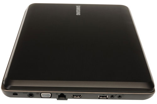 Портов и разъемов в ноутбуке довольно много. На левой стороне находятся два линейных входа/выхода для подключения наушников и микрофона. Также слева можно увидеть USB 2.0, аналоговый видеовыход VGA, цифровой порт HDMI и разъем сетевого контроллера RJ-45. Кроме этого, на левом торце располагается отверстие Кенсингтонского замка и гнездо для подзарядки.