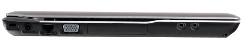 С левой стороны есть два линейных адаптера для подключения микрофона и наушников, а также разъем сетевой карты RJ-45 и видеовыход VGA. Нашлось место и для отверстия Кенсингтонского замка с гнездом для подзарядки. Кроме этого, на левой грани есть интерфейсы, закрытые специальной заглушкой. Среди них HDMI и два горизонтальных порта USB 2.0.