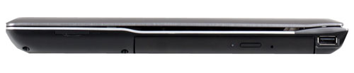 Перед тем, как рассматривать порты, стоит обратить внимание на тот факт, что они немного утоплены в корпус. Правая сторона ноутбука Samsung QX410 заполнена достаточно скромно. Во-первых, основную ее часть занимает встроенный оптический накопитель DVD Super Multi с технологией Dual Layer. С помощью привода можно записывать и воспроизводить, как обычные диски, так и двухслойные. Ближе к переднему краю расположился кардридер, поддерживающий форматы SD и MMC, а в самом конце – интерфейс USB.