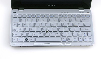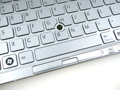 Сенсорная панель полностью отсутствует на VAIO P. Вместо этого VAIO P имеет тачпоинт или трекпоинт, который можно увидеть в некоторых моделях деловых ноутбуков. Трекпоинт очень чувствительный легкий в использовании, и в работе оказался очень приятным. Левая и правая кнопки тачпоинта расположены под пробелом, и имеют поверхностную обратную связь, с характерным щелчком при полном нажатии.