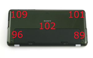 За время проведения тестов, мы заметили, что нетбуки, основанные на Intel Atom выделяют разумное количество тепла во время работы. Sony VAIO P не исключение из этих правил. При нормальных условиях работы, например, просмотре веб-страниц, наборе текста или загрузки электронной почты, температура на поверхности остается в допустимом диапазоне. Ниже на картинке приведены разные значения температур на поверхности нетбука (указано в градусах Фаренгейта), зафиксированные при просмотре веб-страниц и просмотре AVI файлов примерно через 25 минут.